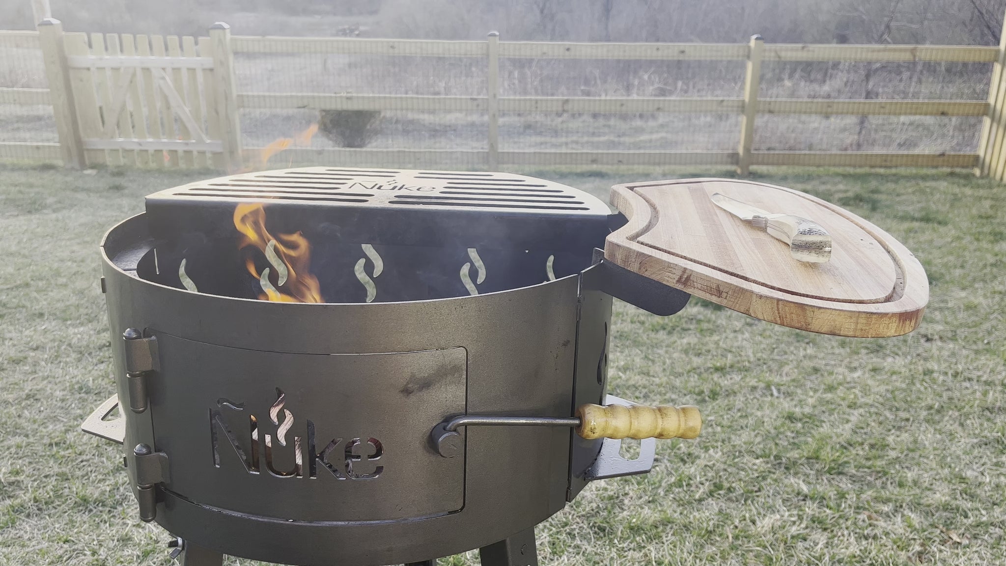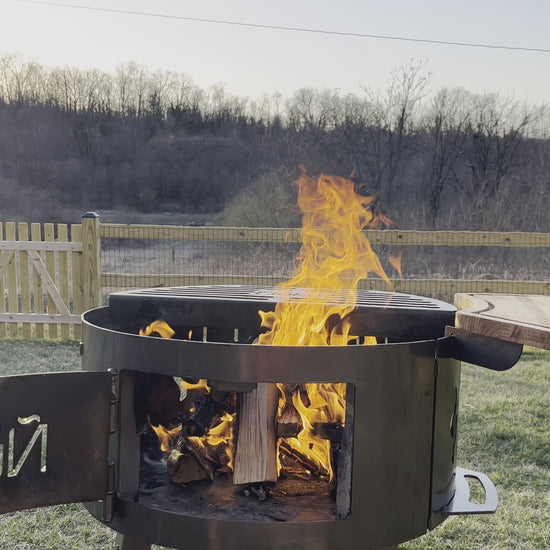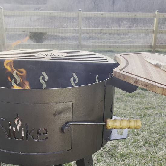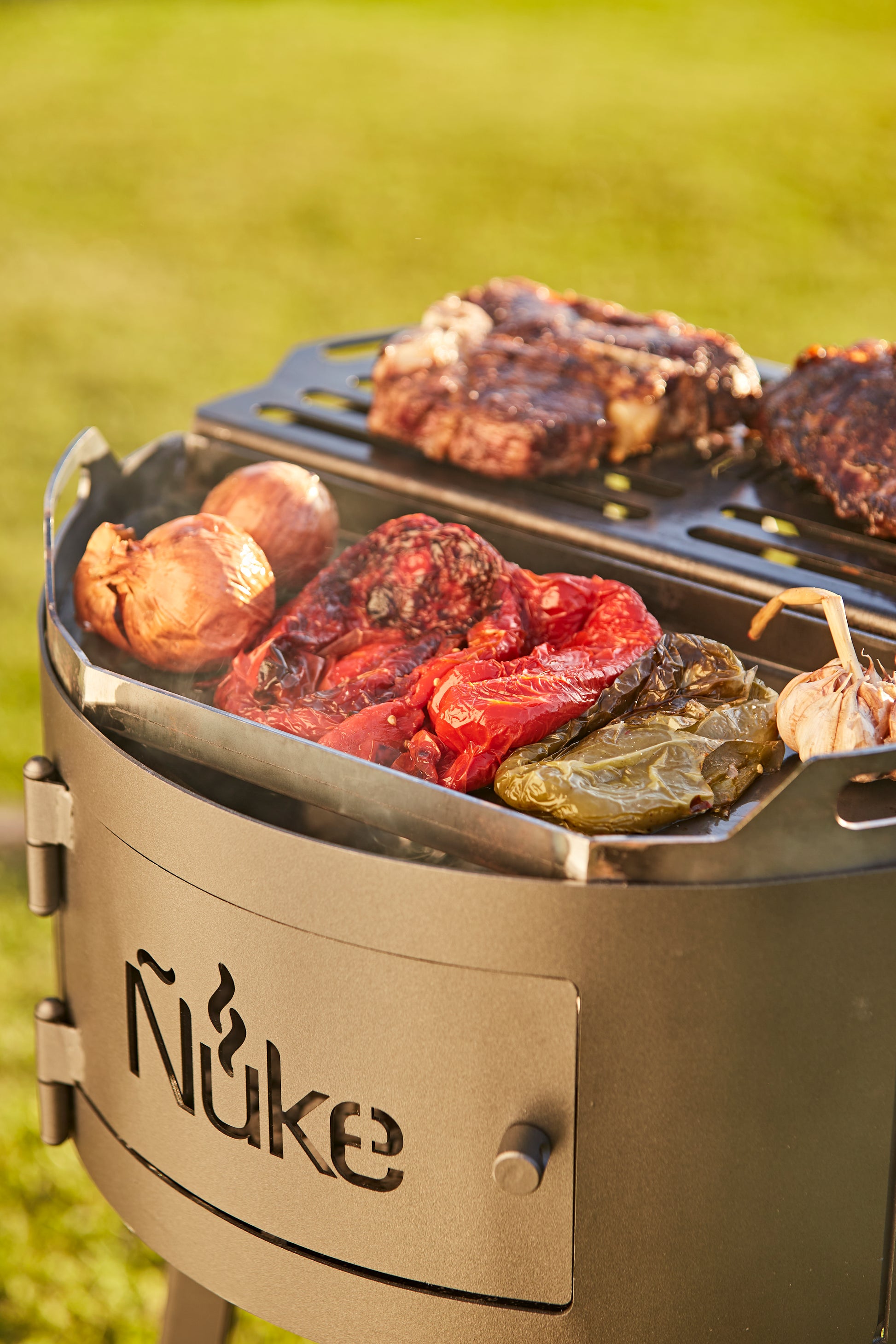 Featuring removable adjustable-height legs, the Malevo can be set up as a ground-level fire pit, or waist-height charcoal and wood grill. A hinged side door built into the heavy-duty steel body provides easy access to the nine-inch-deep coal bed for adding fuel or arranging coals to control the heat. The Malevo also includes a poker to adjust the coals as needed.